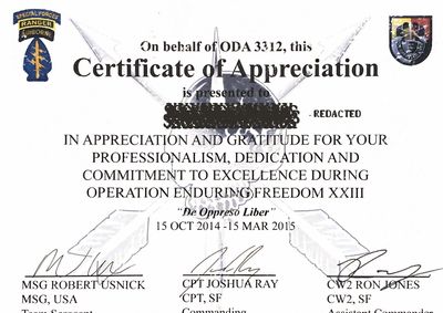 Tolo’s service with the United States military intensified over the years. By 2011 his skillset was sought and utilized by several Special Forces (SFOD-A) groups. Due to his attachment to Special Operations (SOF) teams, the Taliban labeled Tolo an infidel traitor and issued death threats to his family. Tolo notified his Special Forces teams about the threats; then continued supporting the American military forces. The threats to his family further fueled his drive to eradicate the Taliban. They eventually captured Tolo’s uncle, who was working for the United Nations. They stabbed him multiple times, maiming his left leg and leaving him permanently impaired. This attack was a direct message to Tolo.